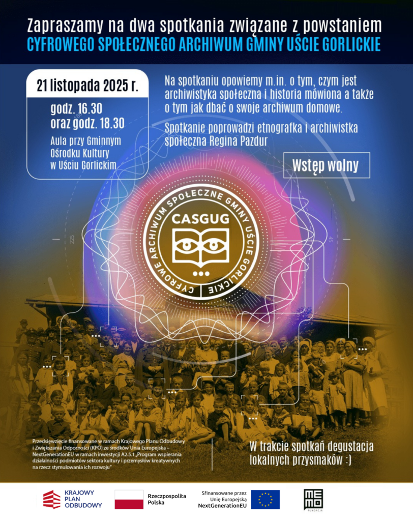 Serdecznie zapraszamy na nasze dwa spotkania, związane z powstaniem Cyfrowego Archiwum Społecznego Gminy Uście Gorlickie. Na spotkaniach opowiemy także o tym czym archiwistyka społęczna jest, o co chodzi z tą „historią mówioną” a także opowiemy o tym jak dbać o swoje archiwa domowe. Na każdego uczestnika i uczestniczkę czeka miła niespodzianka i pyszne lokalne smakołyki.